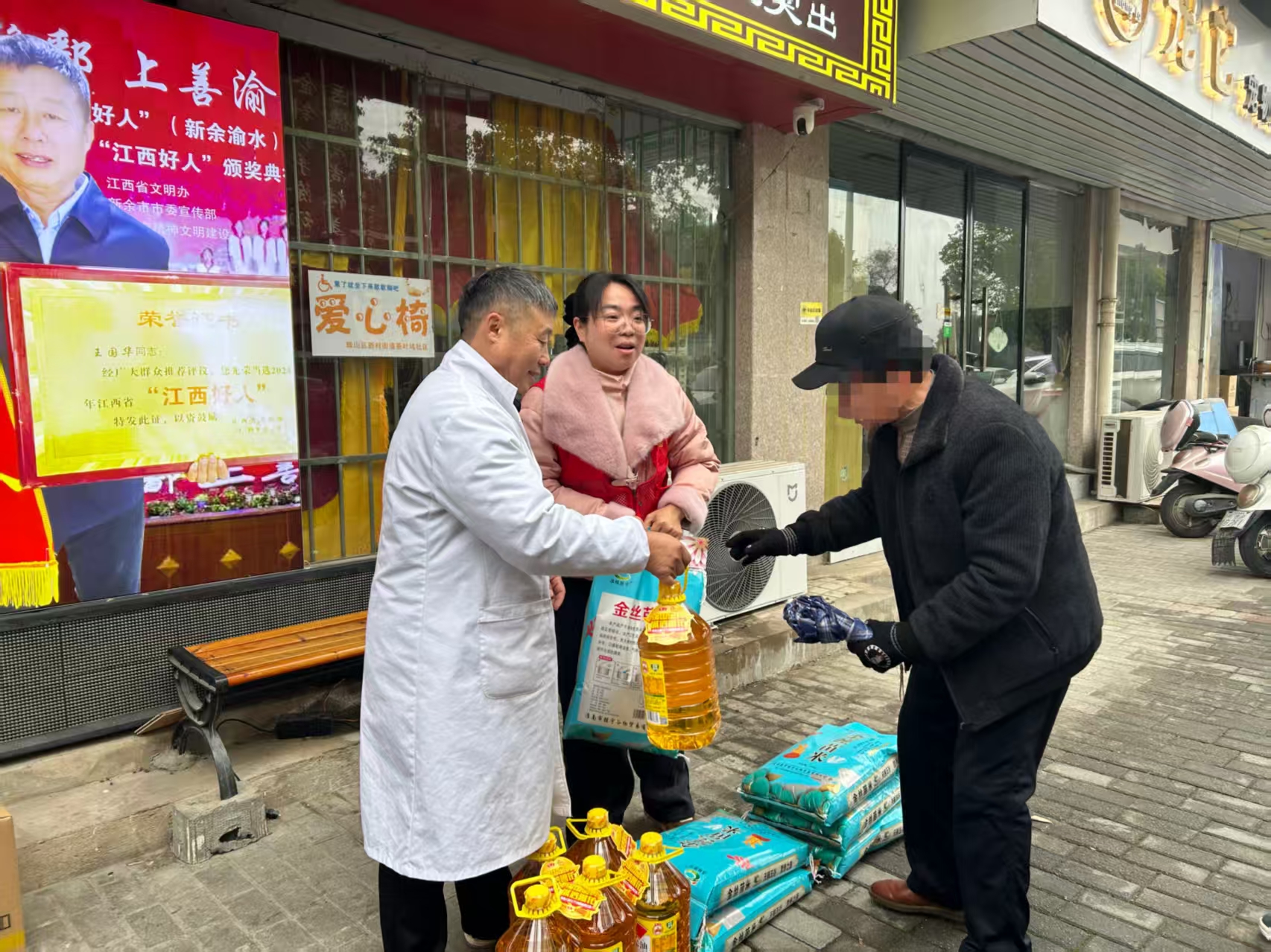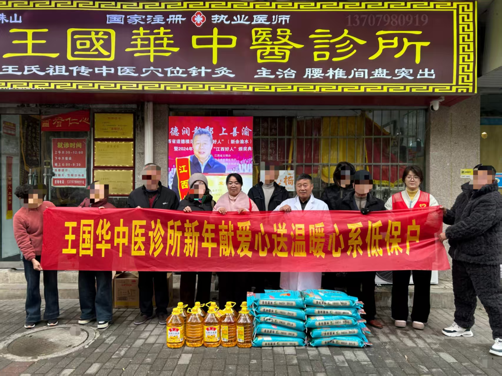 慰问中,中医馆医护人员与社区工作人员一同发放米、油生活慰问品,与群众亲切交谈,详细了解他们的身体状况、生活需求和实际困难,耐心讲解健康知识、用药注意事项和日常防护常识。