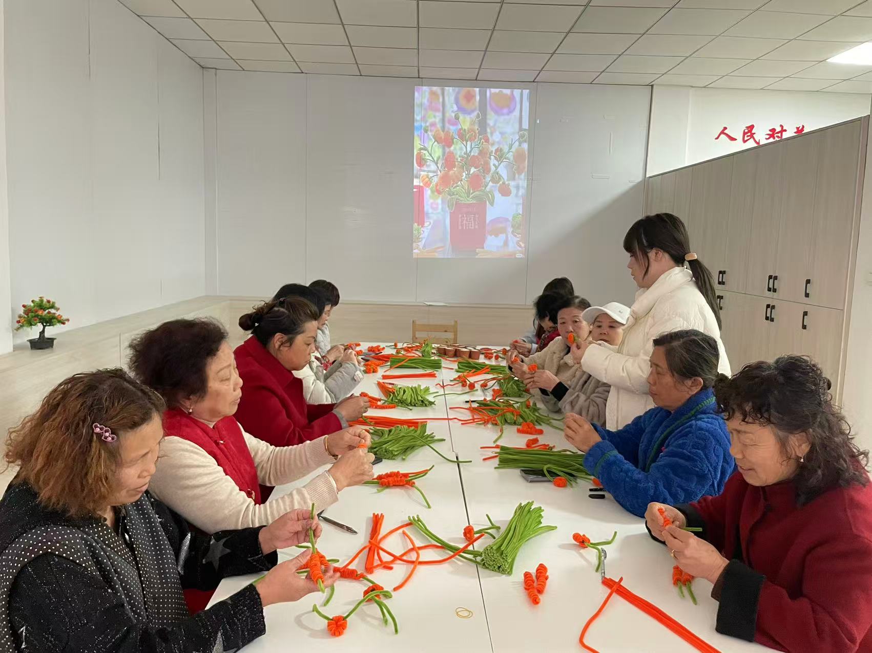 大家兴致高涨,纷纷拿起扭扭棒灵活弯折、翻转、拼接、组合,从一片片花瓣到一朵朵鲜花,再到一整束精致花束,指尖翻飞间,普通的扭扭棒化身寓意为柿柿如意花艺作品。姐妹们相互交流心得、分享巧思、互帮互助,在轻松愉悦的氛围中交流情感、增进情谊,现场洋溢着浓厚的节日气息。